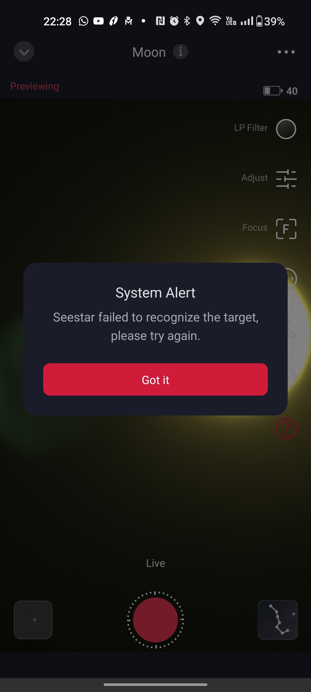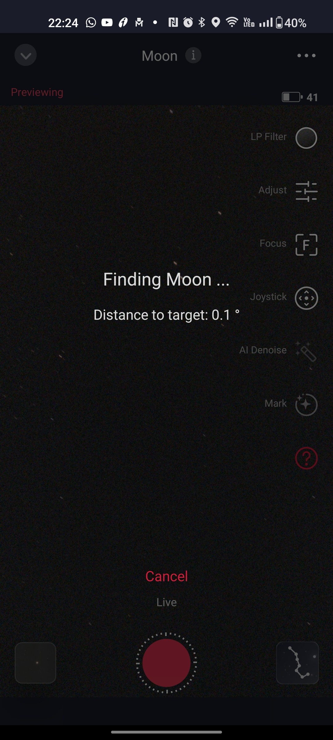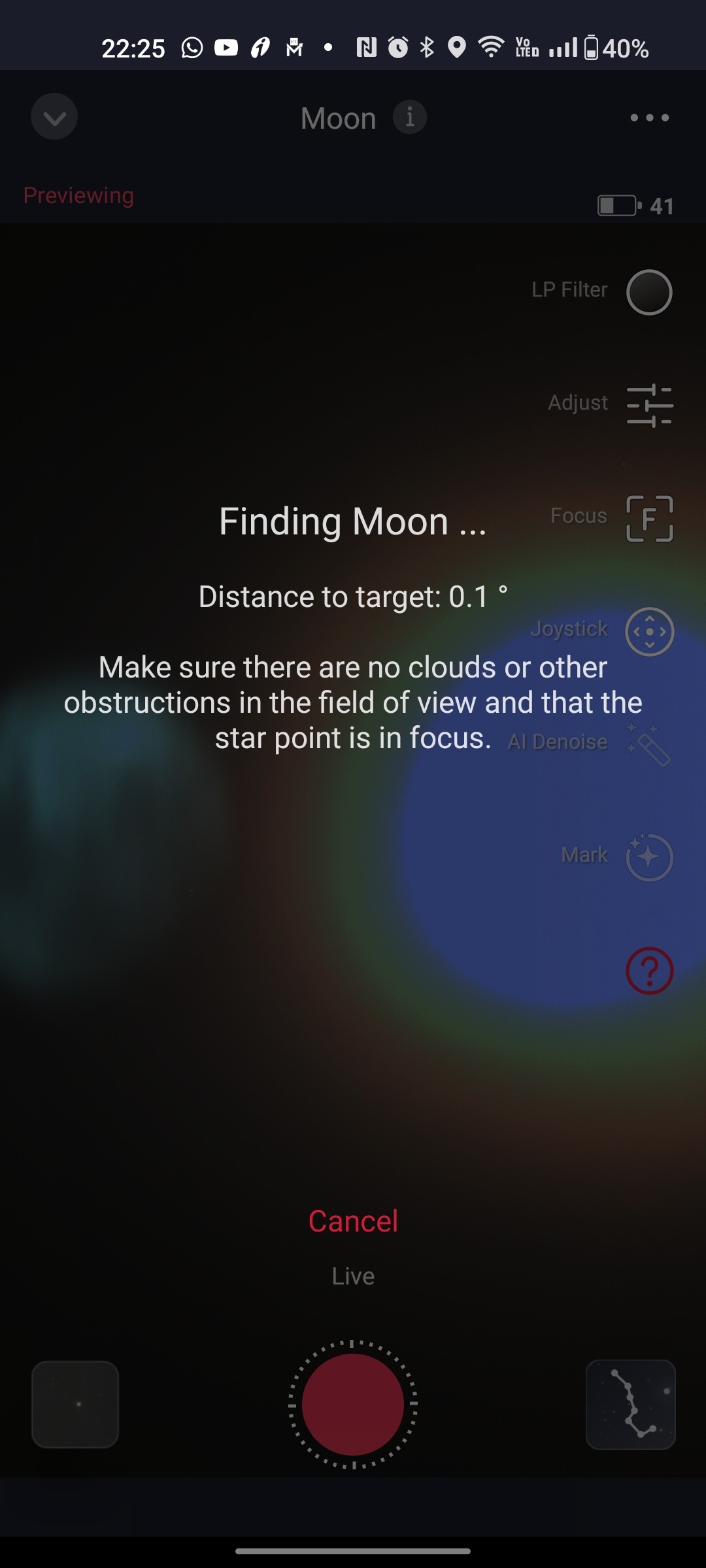 (2) Then GOTO the moon. When the moon appears in the viewfinder, it may look overexposed and show a continuous analysis indicator. Tap the Cancel button.
