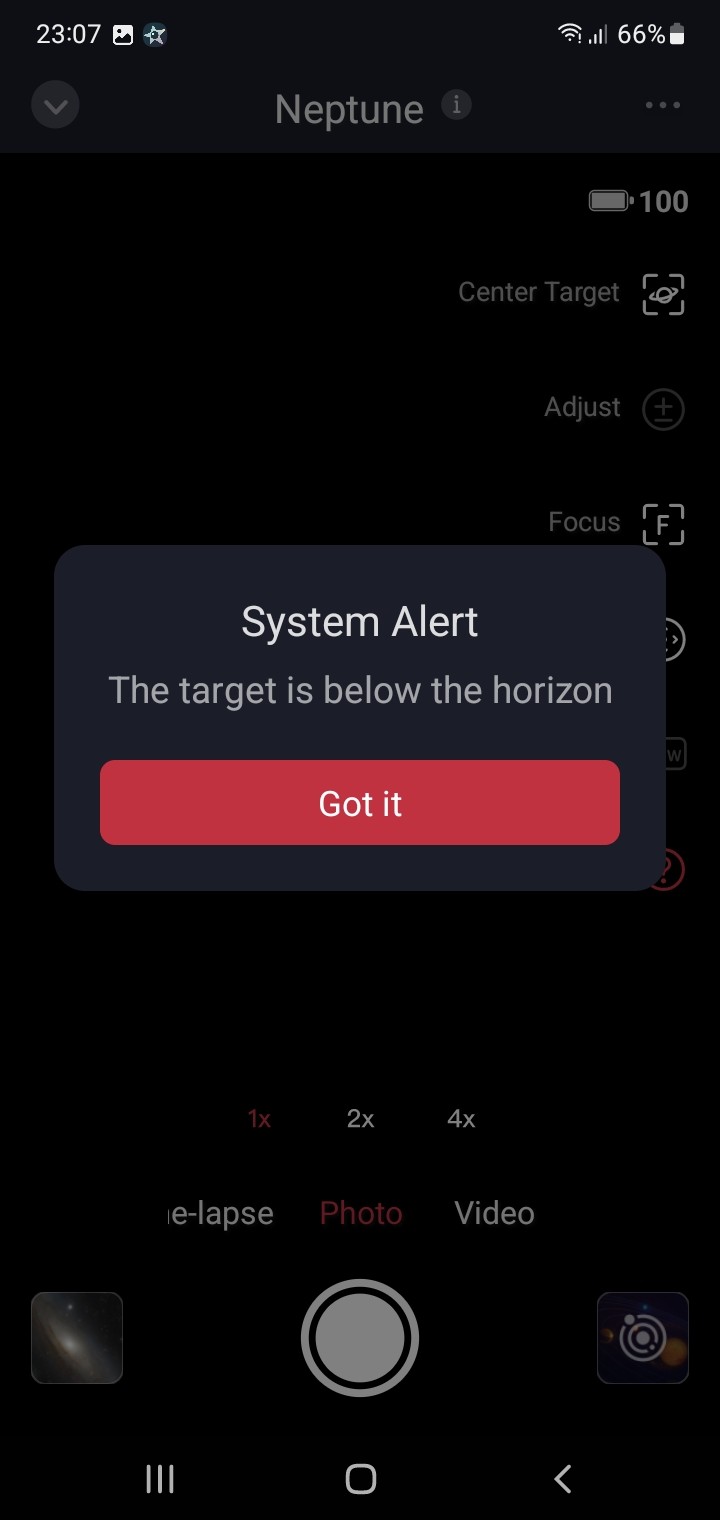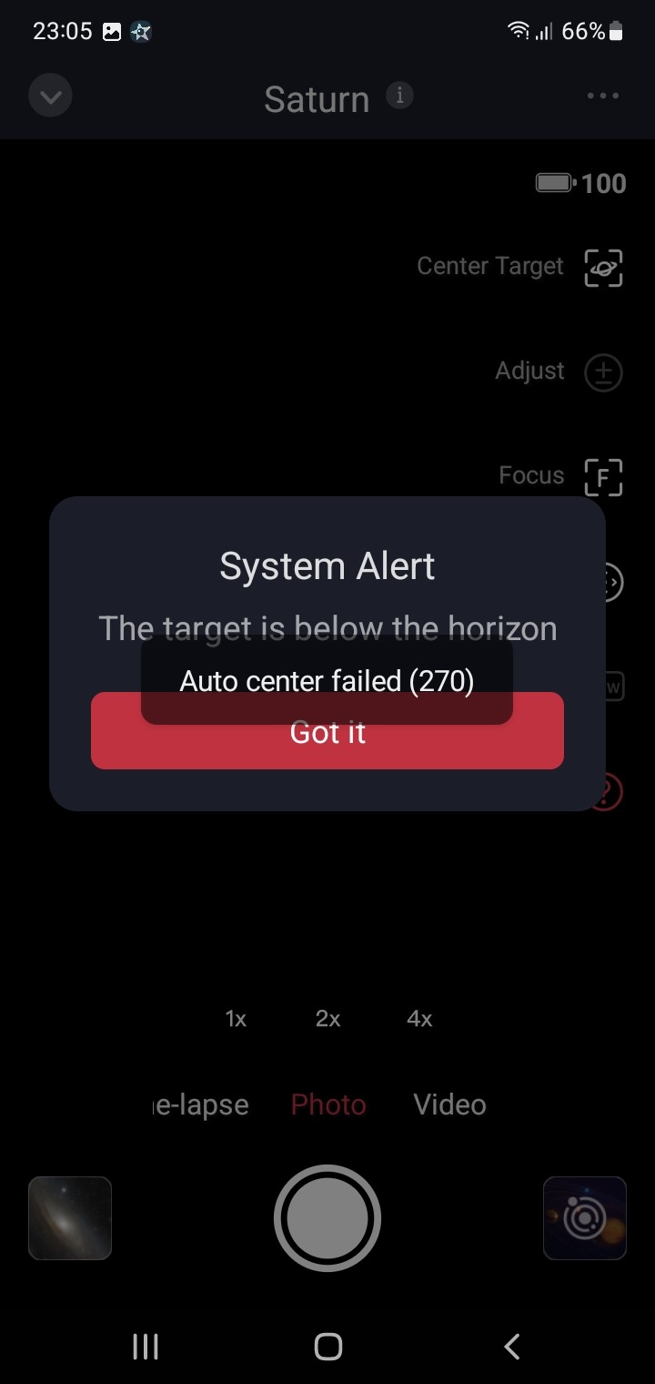 I Leveled Seestar S50 Compass calibrated Lens is clear First turn ON and I did update to latest firmware, all good. Trouble to start due no connection via Bluetooth, in system the app no have Bluetooth to give permission so I must connect via WiFi then no Internet connection. The smart telescope no want find objects when I make choice, showed message "the target is below the horizon" but is visible! In manual mode when i find object the tracking does not work.