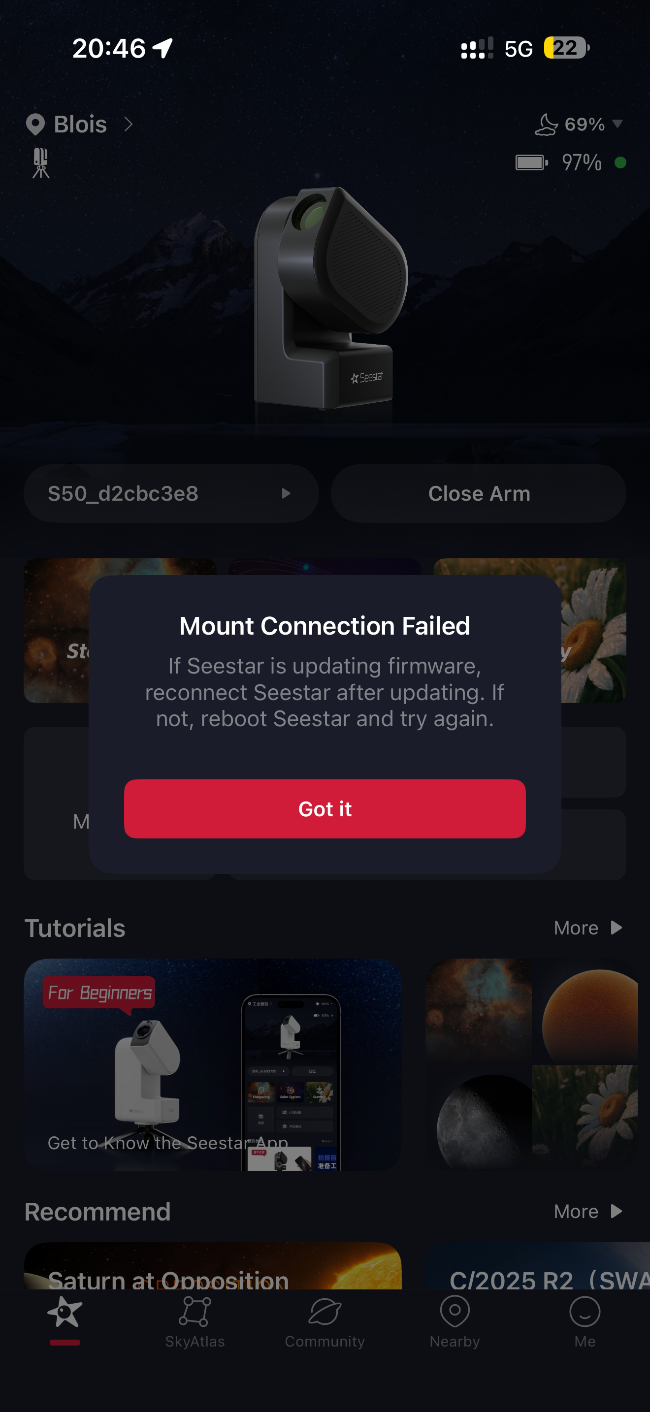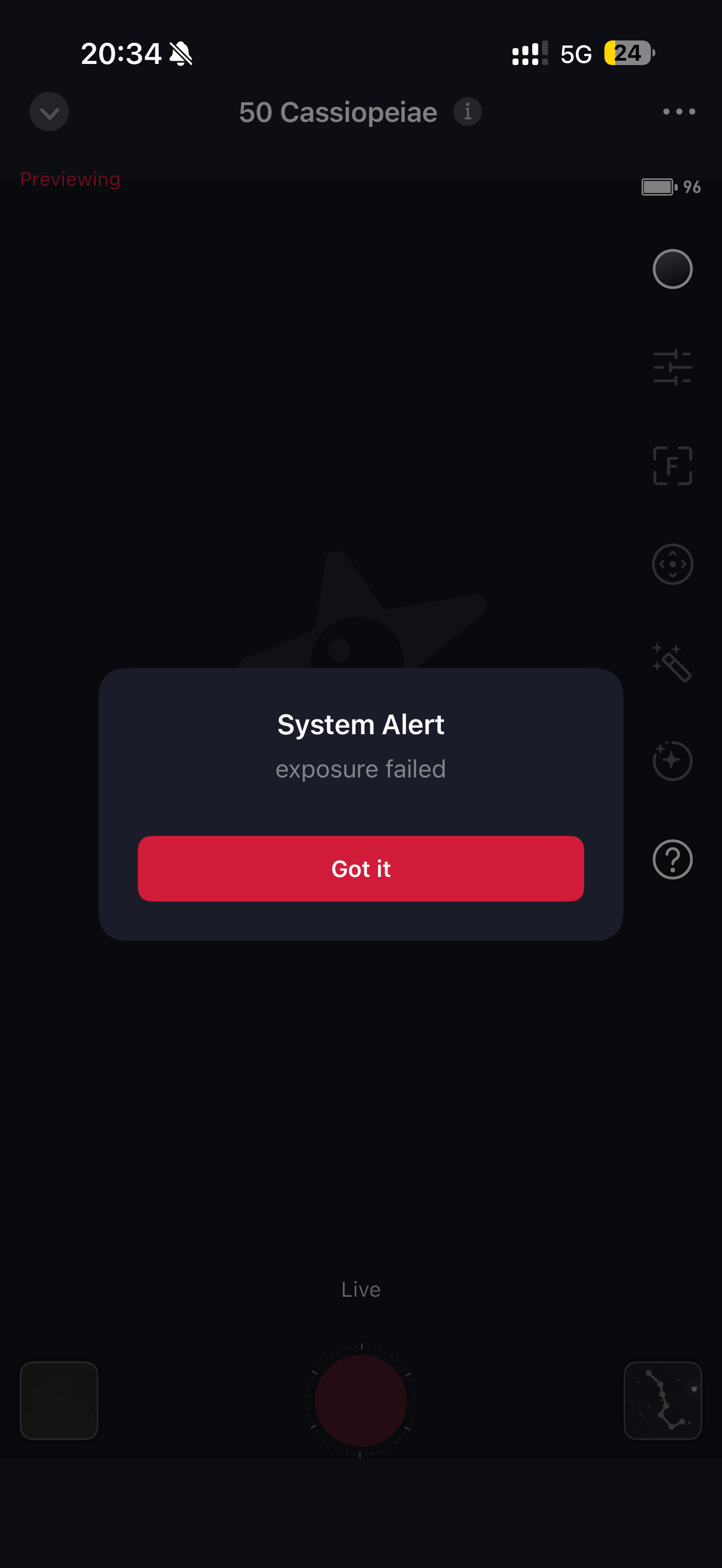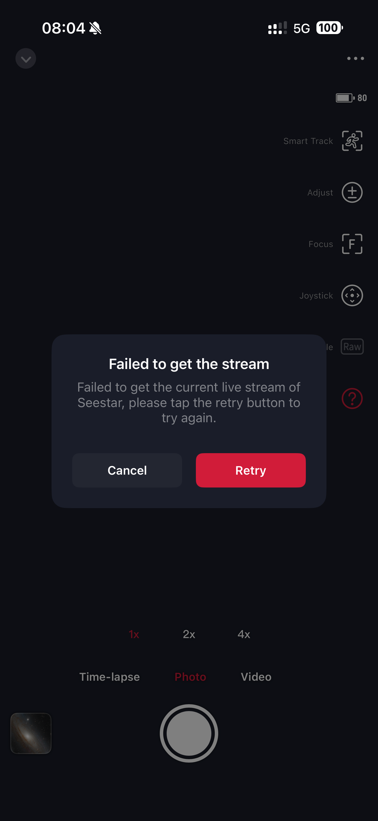 I’ve been trying several times to restart and reconnect, but I keep getting the same error (see attached screenshot). The Seestar S50 doesn’t show any live images — the camera just won’t open.