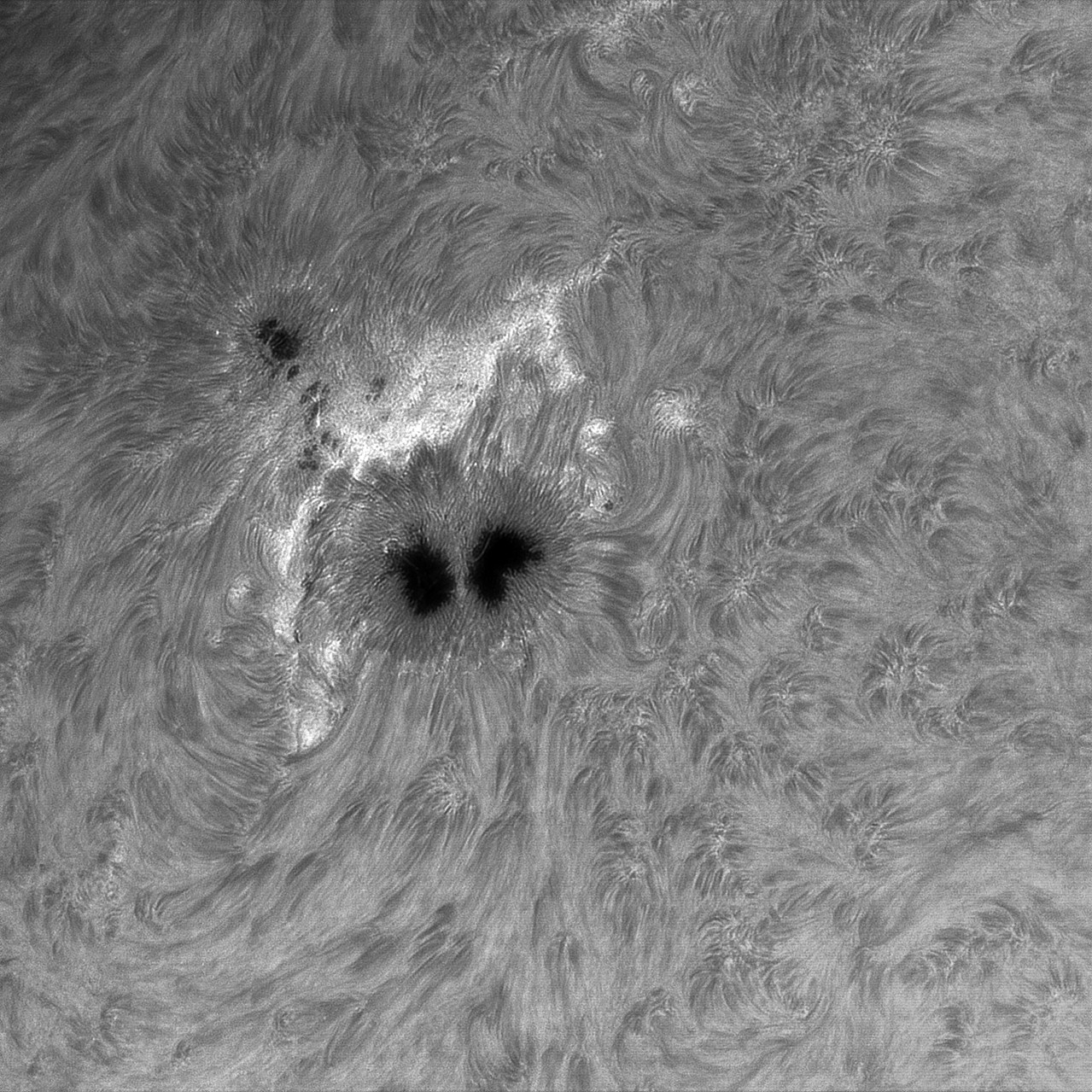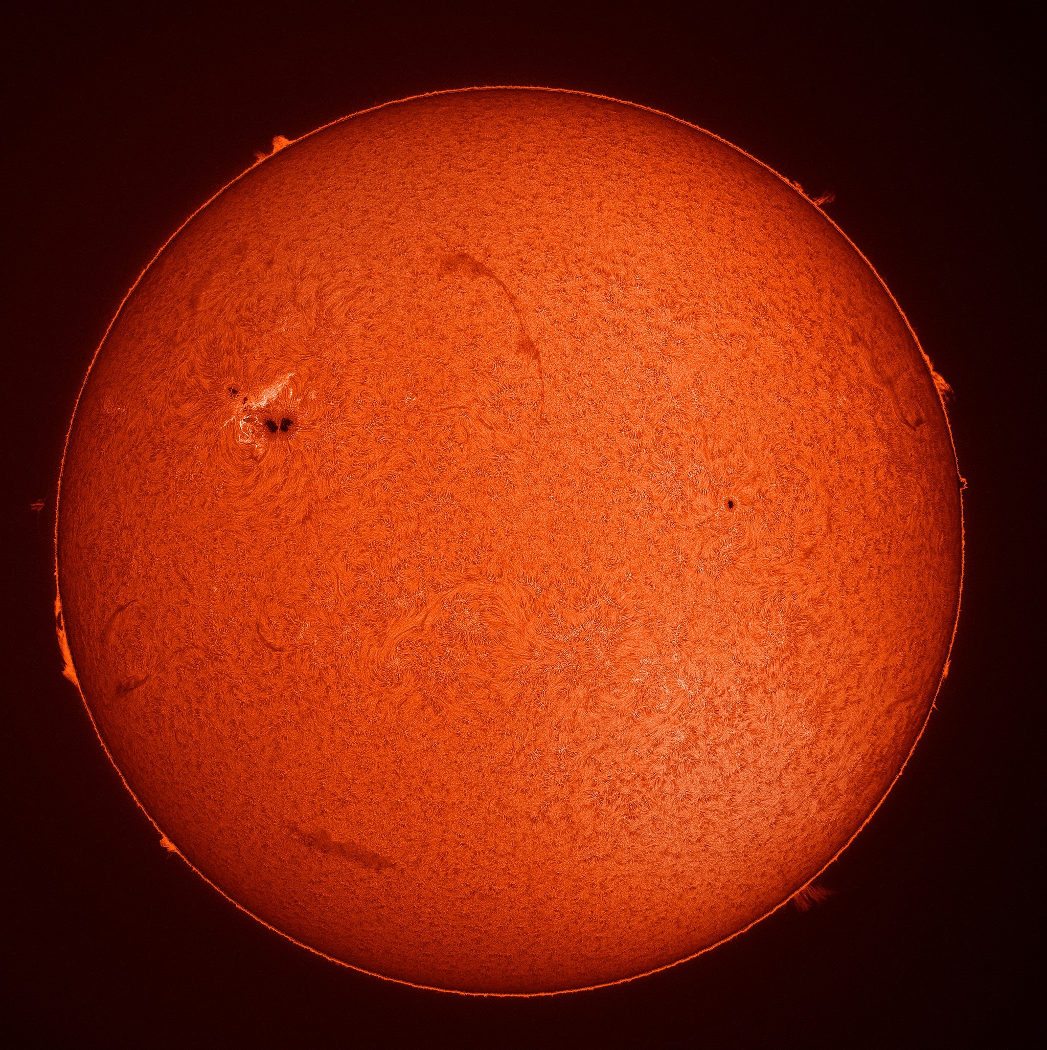 Full sun and high-resolution detail Capture data: LZOS 152mm triplet F8 160mm ERF SolarSpectrum filter 32mm 0.3Å Baader 4x telecentric system ZWO ASI183MM Videos stacked with AutoStakkert and edited with imppg :-) Bernd