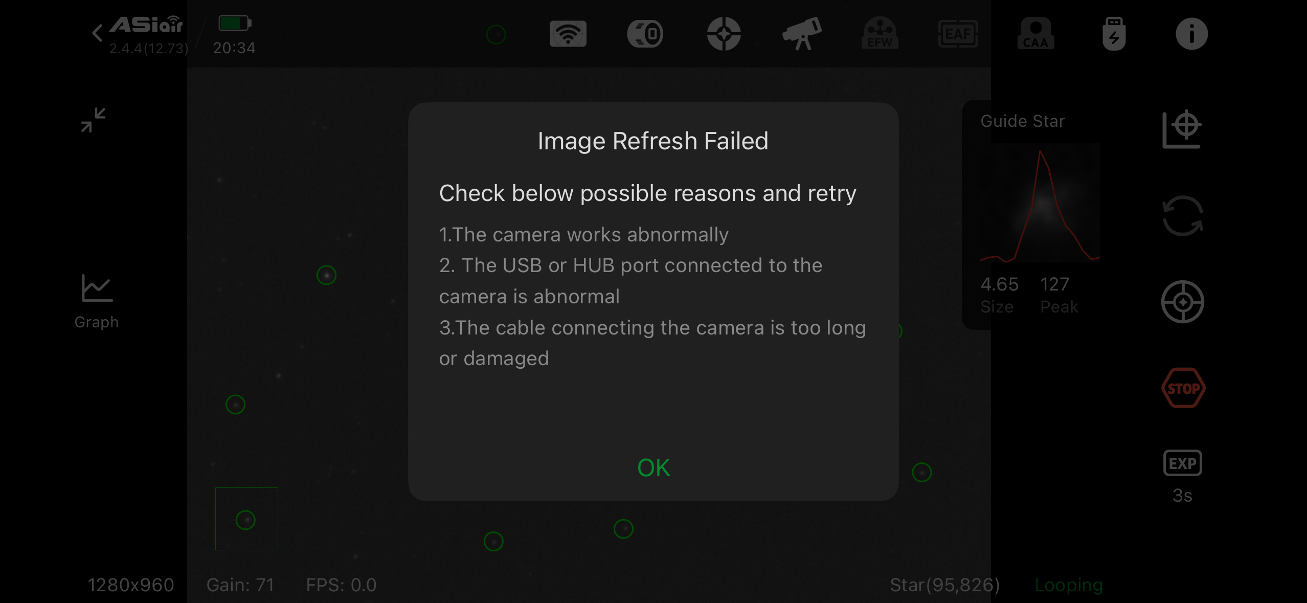 The first night, the guide camera disconnected and gave the error message in the image below.