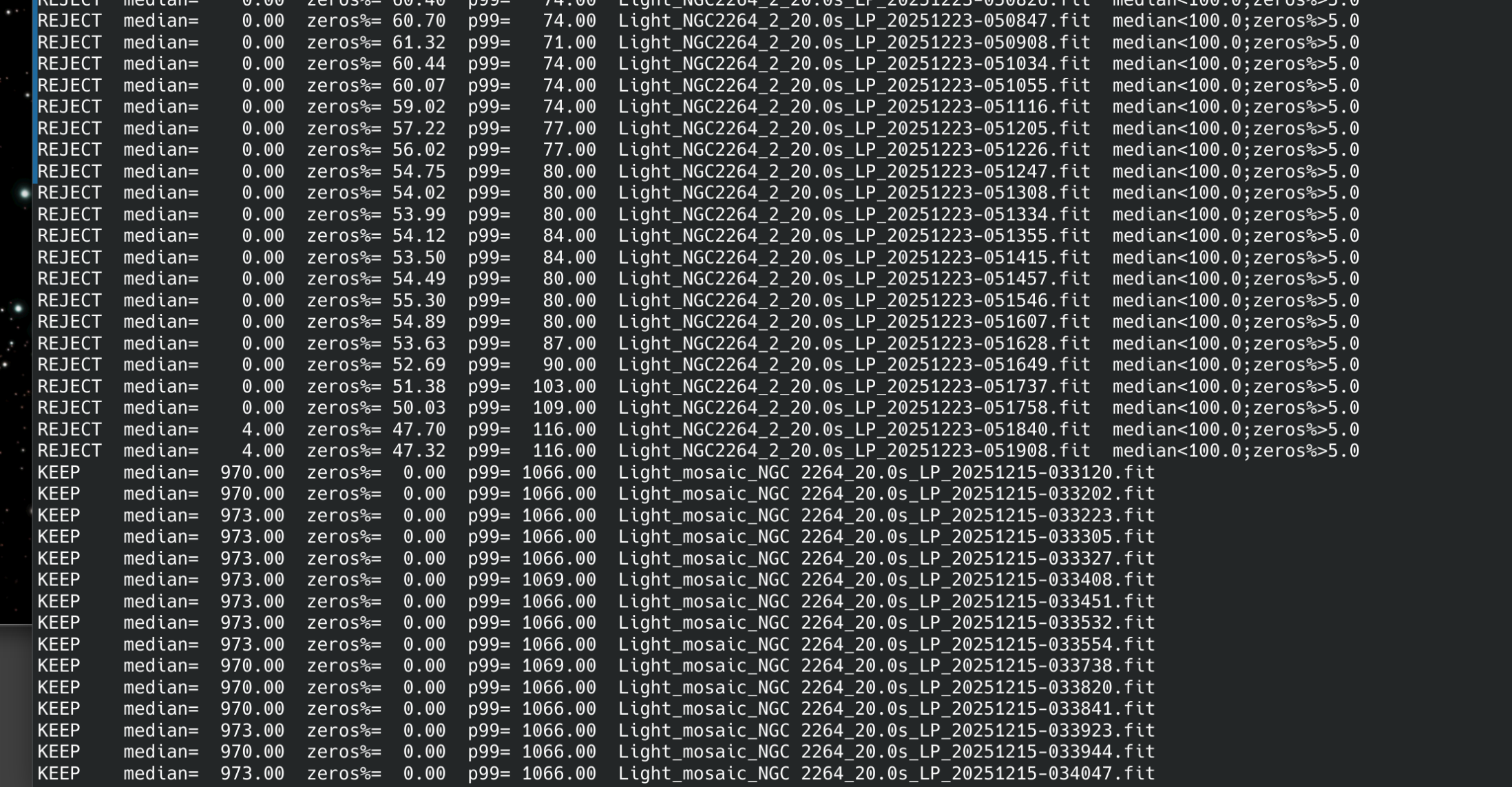 Also the Subframeselector could not load multiple subs at once so I made a script to meassure them with astropy to confirm my hypothesis that somehow the calibration on these files was off - not that I let it print Reject on corupt files: